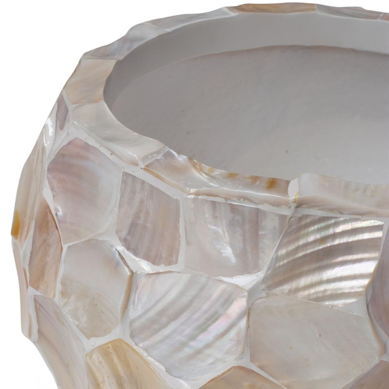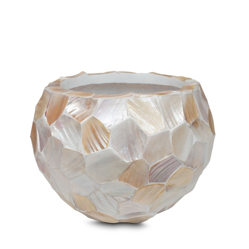 Luxusní květináč Shell White s vnějším průměrem 36 cm a výškou 25 cm má kulatý tvar. Konstrukce květináčů je vyrobena z kvalitního pevného kompozitního materiálu. Povrch je vykládaný pravou bílou perletí. Květináč je ručně vyrobený a to zaručuje originál každého kusu. Vhodný do interiéru. Doporučujeme zakoupit gumovou vložku a vodoznak, díky kterému budete mít přehled o stavu hladiny vody.