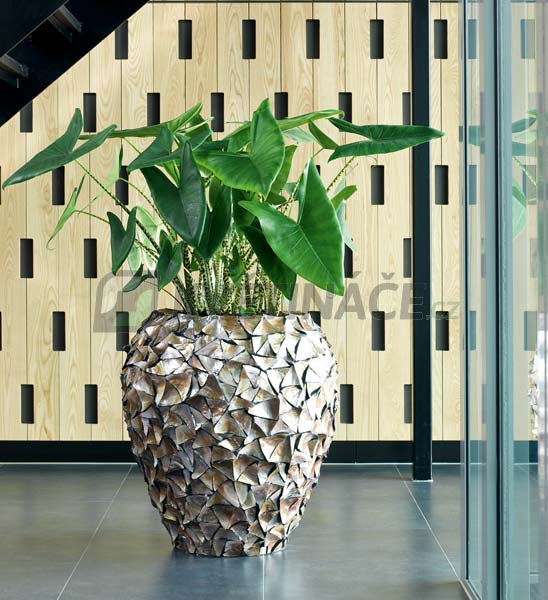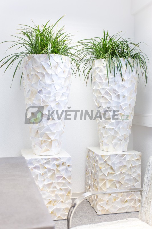 Luxusní květináč Shell White s průměrem 74 cm a výškou 80 cm má kulatý tvar. Konstrukce květináčů je vyrobena z kvalitního pevného kompozitního materiálu. Povrch je vykládaný pravou hnědou perletí. Květináč je ručně vyrobený a to zaručuje originál každého kusu. Vhodný do interiéru. Doporučujeme zakoupit gumovou vložku a vodoznak, díky kterému budete mít přehled o stavu hladiny vody.