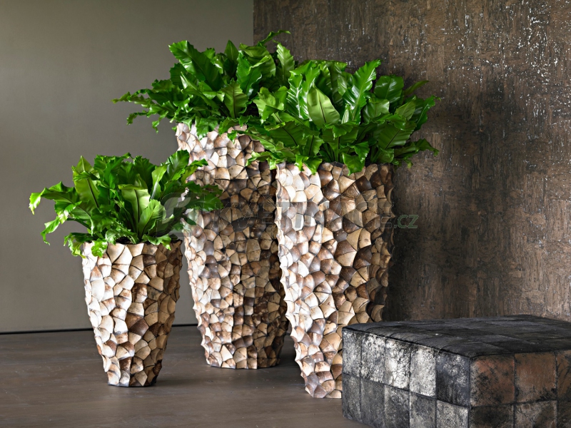 Velice luxusní květináč Tunda shell partner natural 50x70cm má povrch ručně vykládaný z pravých kokosových skořápek kokosu a konstrukce je vyrobena z kompozitního materiálu, který je lehký, ale velice pevný. Pro osázení živou rostlinou doporučujeme gumovou vložku a vodoznak.