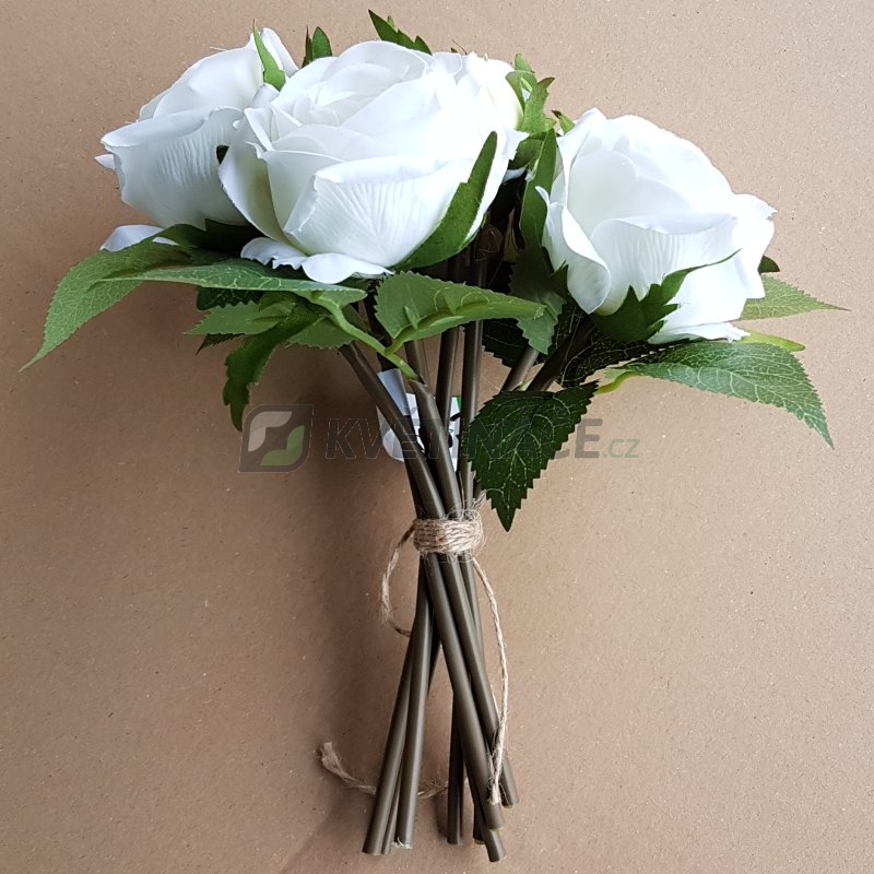 Umělá malá kytice z bílých růží má 8 stonků a výšku 24cm vypadá jako živá, která jistě zaujme každého. Provedení různobarevné. Velice vhodné do komerčních prostor jako je recepce hotelu, svatby nebo prostě tam kde potřeba oslnit nádherným pugétem. Skleněná váza není součástí balení.