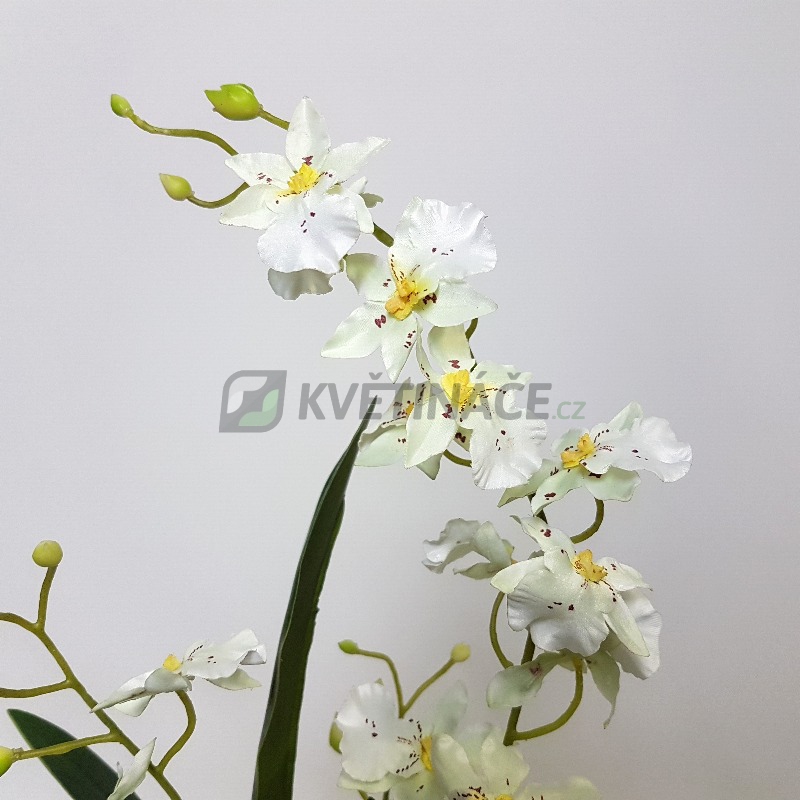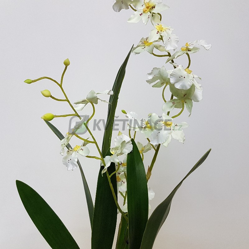 Umělá bílá orchidej Oncidium bílá s výškou 65cm je vhodná do tmavých místností nebo pro často cestující, kteří nemají čas se starat o živé rostliny. Vypadá velice věrohodně. Květináč není součástí balení.