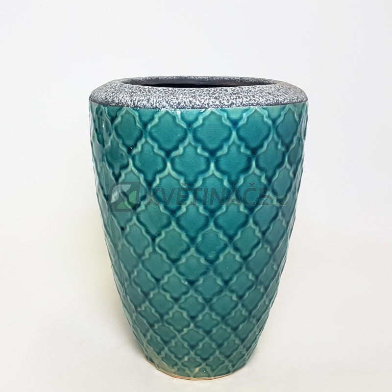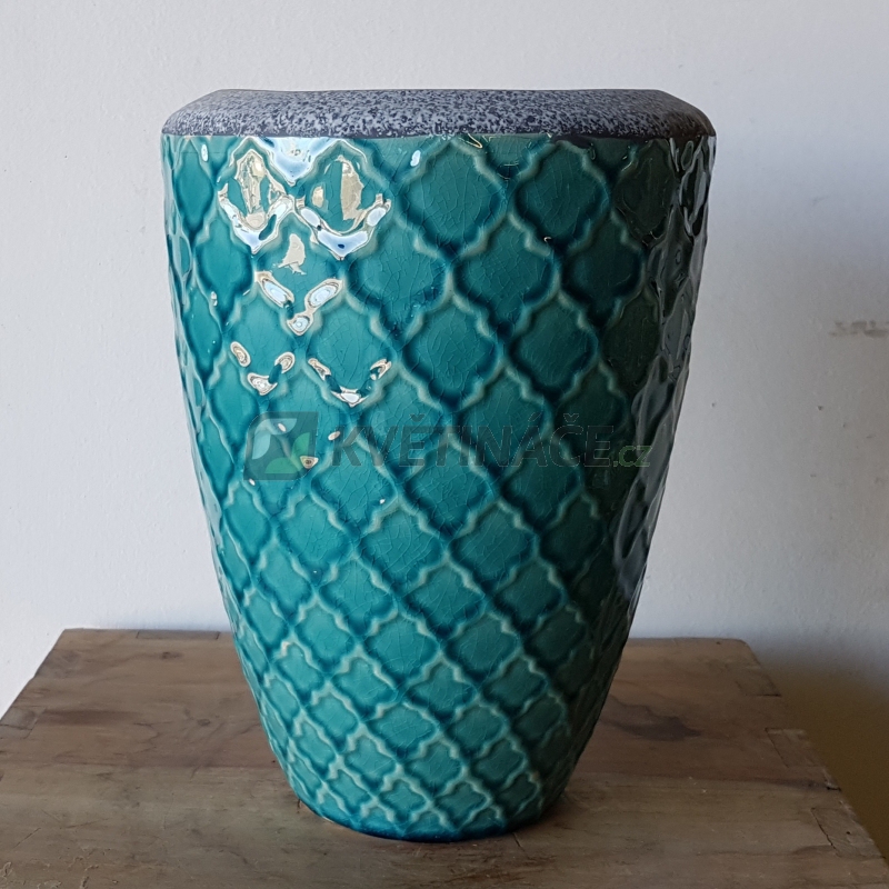 Stolní keramická váza Trento má lesklou tyrkysovou barvu a rozměry 19x27cm. Ručně vyrobené a odolné proti poškrábání. Použití v interiéru a letním období i v exteriéru. Nádoba je vodotěsná.
