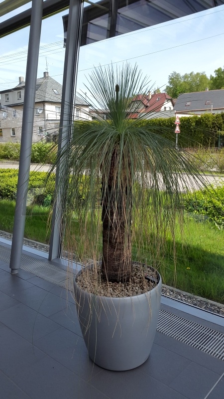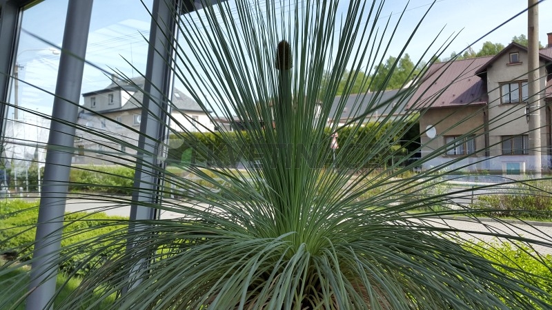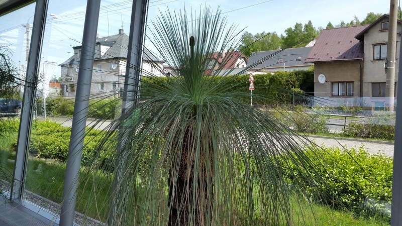 Xanthorrhoea Glauca s průměrem květináče 50cm a výškou 200cm a výškou kmene cca 120cm. Jedná se o velice exotickou rostlinu z Austrálie. Vyžaduje slunné místo s kyprou zeminou a velice mírnou závlahou. Ideální teplota kolem 20 - 25 C. Zalévat v létě jedním litrem za měsíc. Stáří rostliny cca 100 let.