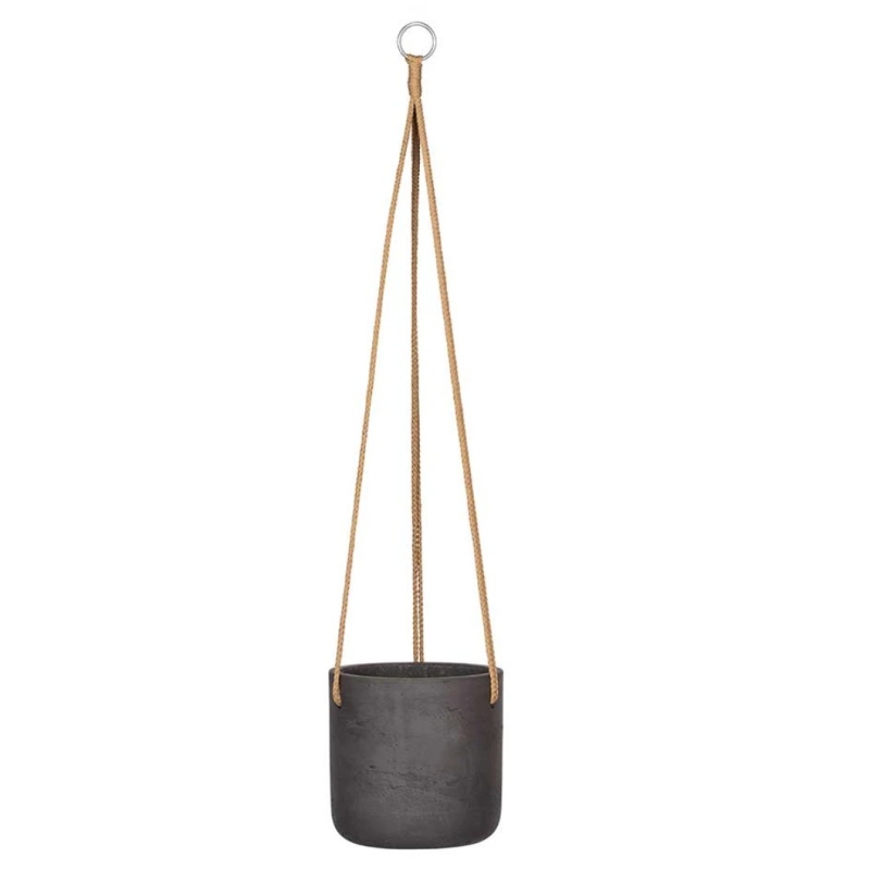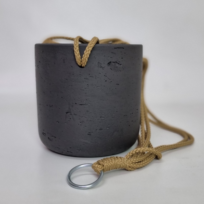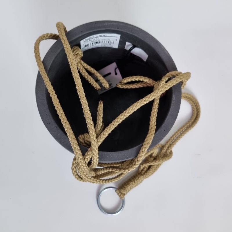 Závěsný květináč pottery charlie XS černý s rozměry 12 x 12 cm má černou matnou barvu. Je vyrobený z kompozitního materiálu, který dokonale imituje keramiku. Tří bodové zavěšení je na masívních provazech. Květináč je vodotěsný a je tedy primárně vhodný do interiéru. Při použití v deštivém exteriéru je nutné vyvrtat odtok vody. Délka zavěšení je cca: 50 cm až 55 cm. Součástí zavěšení je masivní kroužek.