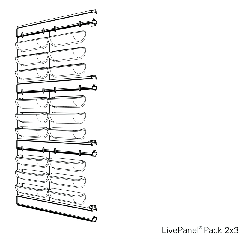 Živá zelená stěna LivePanel Pack 2x3 s rozměry: šířka 87 cm x výška 157 cm s plochou 1,37m2. Konstrukce zelené stěny se skládá z 6 kazet na 9 rostlin, 3 rezervoárů. Celkem se tedy do stěny vkládá 54 rostlin. Stěna může být zavěšena v interiéru tak nemrznoucím exteriéru na jakoukoliv zeď s nosností kolem 60 kg. LivePanel Pack 2x3 je kompletní balení včetně montážních šroubů a návodu. Velká výhoda vertikální zelené stěny je, že nepotřebuje elektřinu ani přípojku na vody. Stačí 1 x za cca 10 dní naplnit nádrže konvičkou, kde je ukazatel hladiny vody. Balení neobsahuje rostliny. Doporučený rozměr balu rostlin je 9cm. Montáž je jednoduchá a nezabere více jak 2 hodiny.