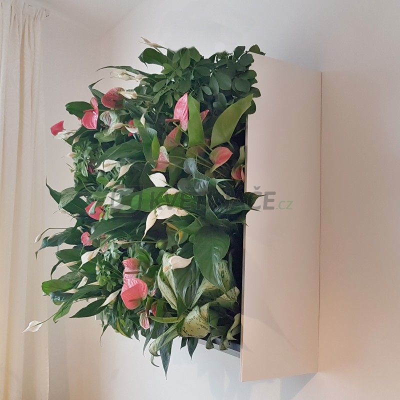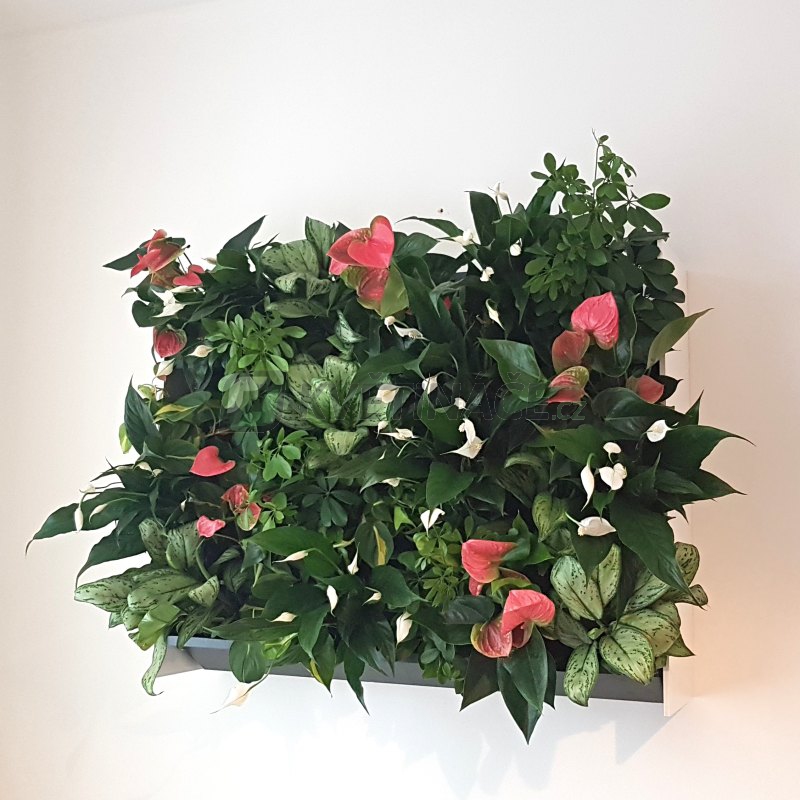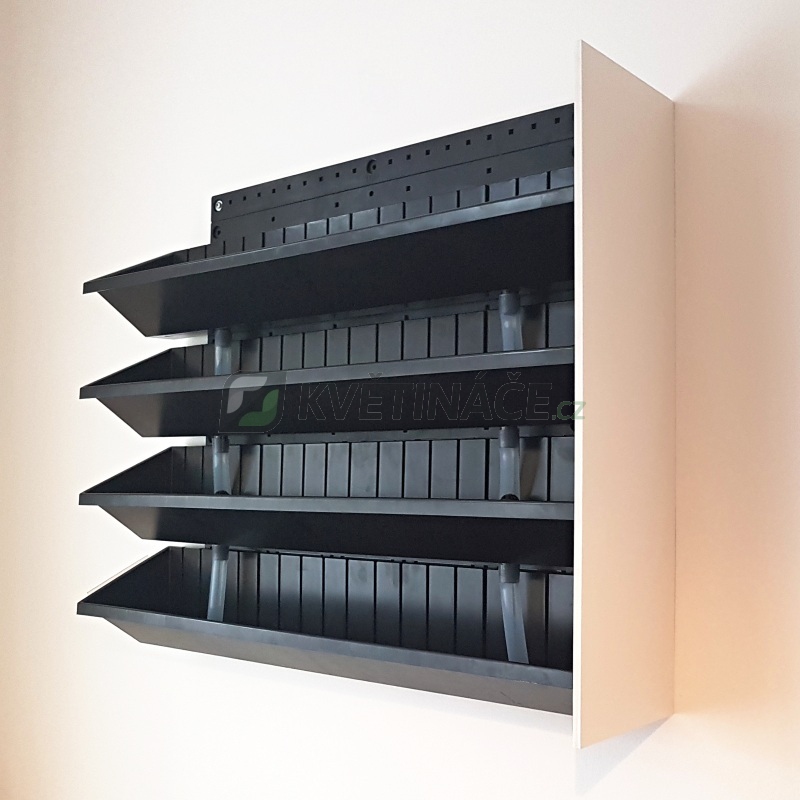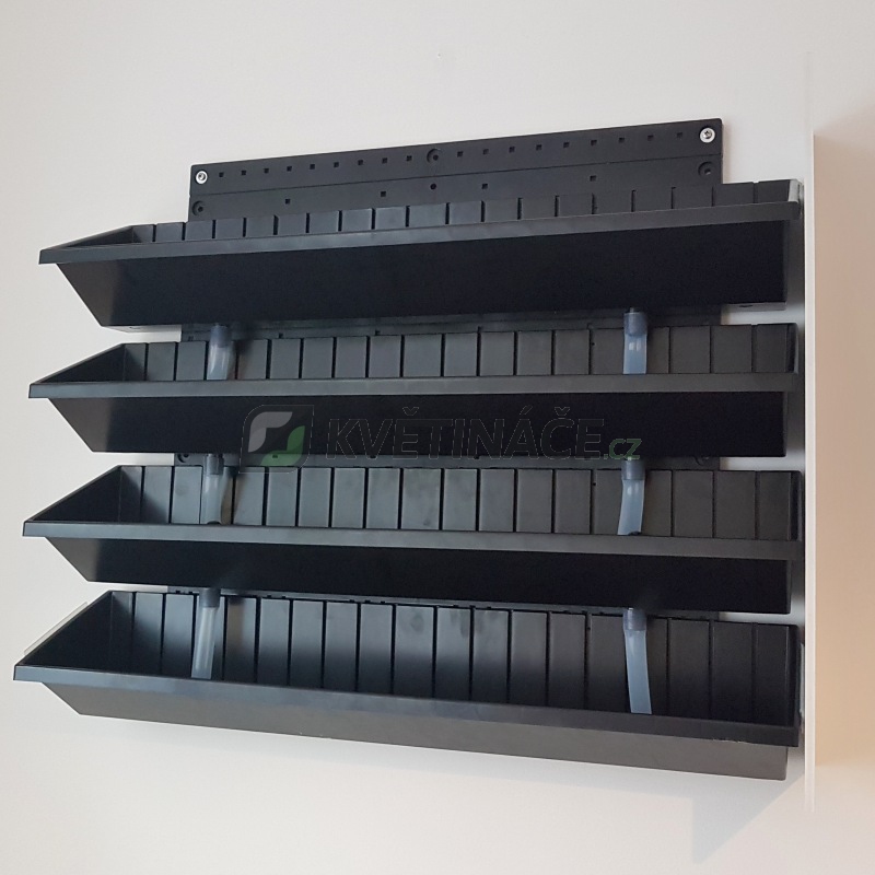 Zelená živá stěna základní set s rozměry šířkou 100cm a výškou 82cm. Ten se skládá ze 4 pater vodorovně zavěšených na nosné konstrukci. Do každého patra lze vložit 4 až 7 rostliny s průměrem balu 13 - 14cm. Objem nádrže vody v každém patře je 7 litrů. Vhodné pro rostliny hydroponní tak i pěstované v klasickém v substrátu. Jednoduchá montáž je ohromnou předností této stěny a na zeď to zvládnete namontovat do 60 minut včetně rostlin. Výměna uhynulých nebo špatně vypadajících rostlin je snadná a rychlá i pro naprostého laika. Zelenou živou stěnu lze také neomezeně napojovat jak do šířky. (např. ze čtyř modulů lze vytvořit souvislou stěnu o rozměrech š. 400cm x v. 75cm) V ceně jsou zahrnuty základní položky (nosná základna, 3 x truhlíky s přepadem vody a všech nutných hadic pro přepad vody + 1 x nejspodnější truhlík bez přepadu vody). Cena je bez šroubů, bočních krycích panelů, rostlin a bodových světel.