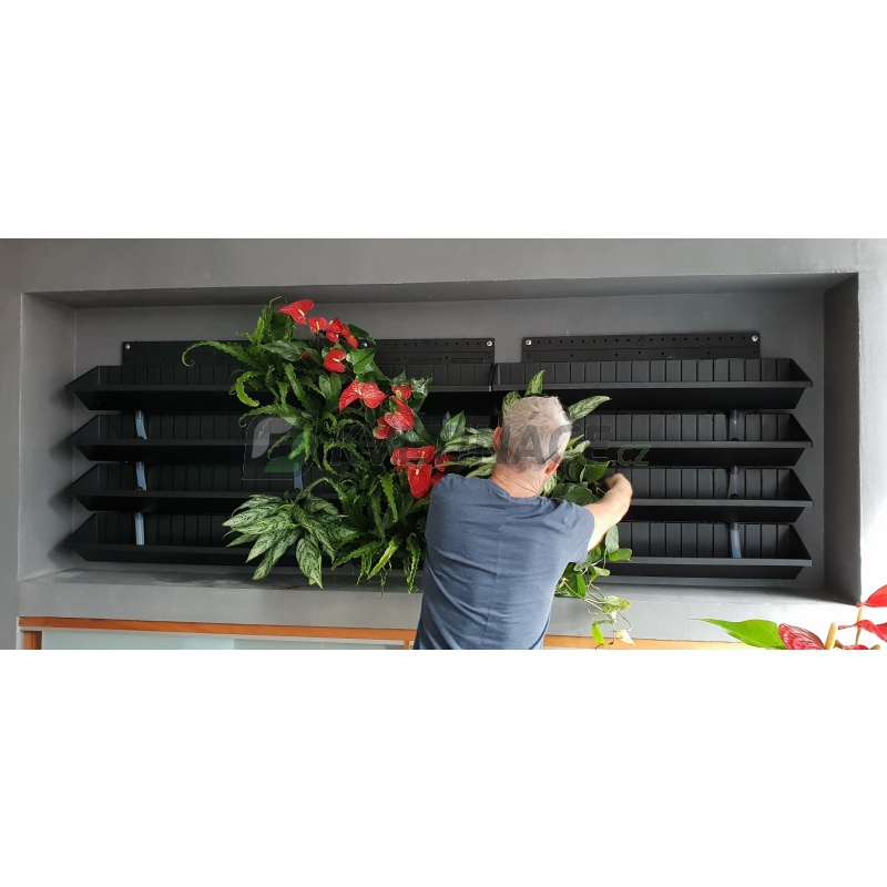 Živá zelená stěna LivePanel Pack 6x4 s rozměry: šířka 248 cm x výška 206 cm s plochou 5,12m2. Konstrukce zelené stěny se skládá z 24 kazet na 9 rostlin, 4 rezervoárů.