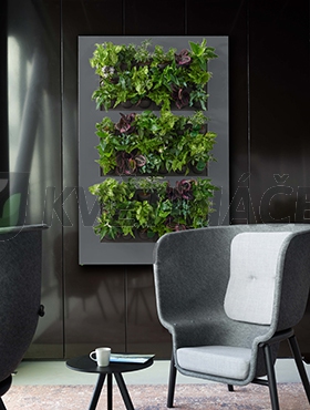 Živý obraz v černé matné barvě o rozměrech 192 x 72 x 7 cm obsahuje 4 kazety na 36 rostlin s rozměry 160 x 40 cm. Samozavlažovací systém na 29 litrů vody součástí balení. Zálivka vystačí až na 6 týdnů dle výběru květin.